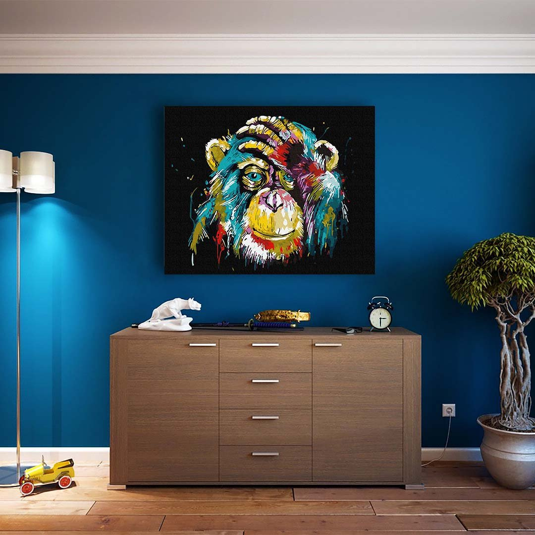 Malen nach Zahlen auf Keilrahmen – Schimpanse in leuchtenden Farben 50x40 cm Bild zum Ausmalen nach Zahlen