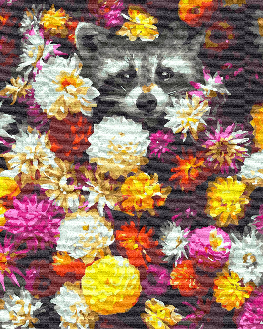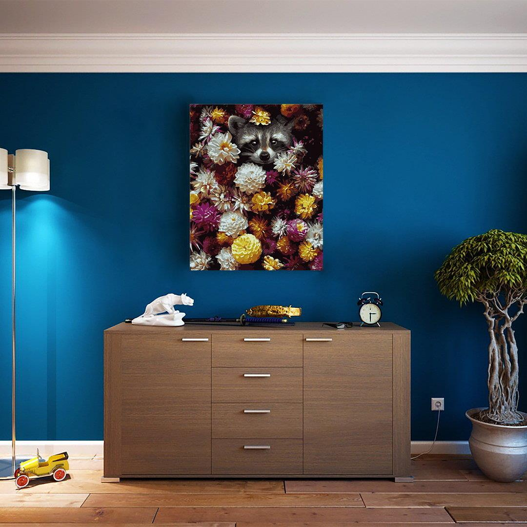Malen nach Zahlen auf Keilrahmen – Waschbär in Blumen 50x40 cm Bild zum Ausmalen nach Zahlen
