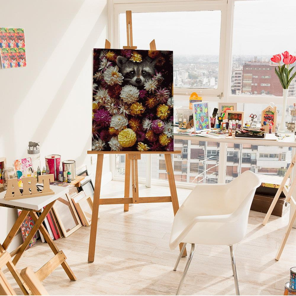 Malen-nach-Zahlen-Set Waschbär in Blumen 50x40 cm auf Holzkeilrahmen