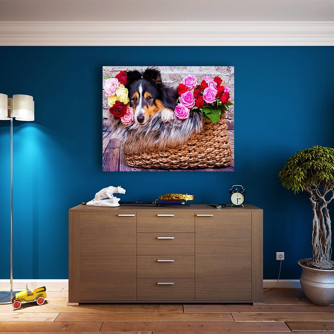 Zum Malen nach Zahlen einstellen Kleiner Hund im Korb mit Blumen Gemälde nach Zahlen 30x40cm