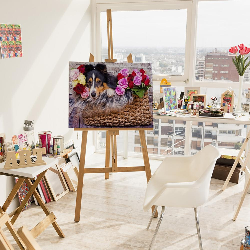 HINWEIS: Das Angebot gilt für ein Malset. Kleiner Hund im Korb mit Blumen Gemälde nach Zahlen Größe 30x40 cm AUF EINEM HOLZRAHMEN