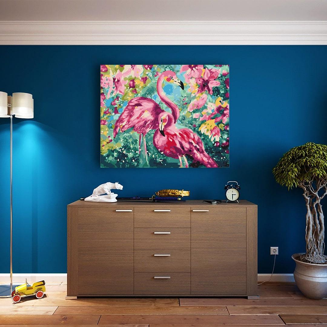 Malen nach Zahlen auf Keilrahmen – Flamingos in Blumen 50x40 cm Bild zum Ausmalen nach Zahlen