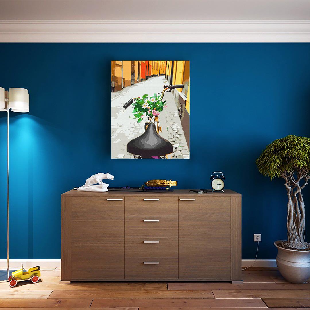 Malen nach Zahlen auf Keilrahmen – Radfahren in der Altstadt 50x40 cm Bild zum Ausmalen nach Zahlen