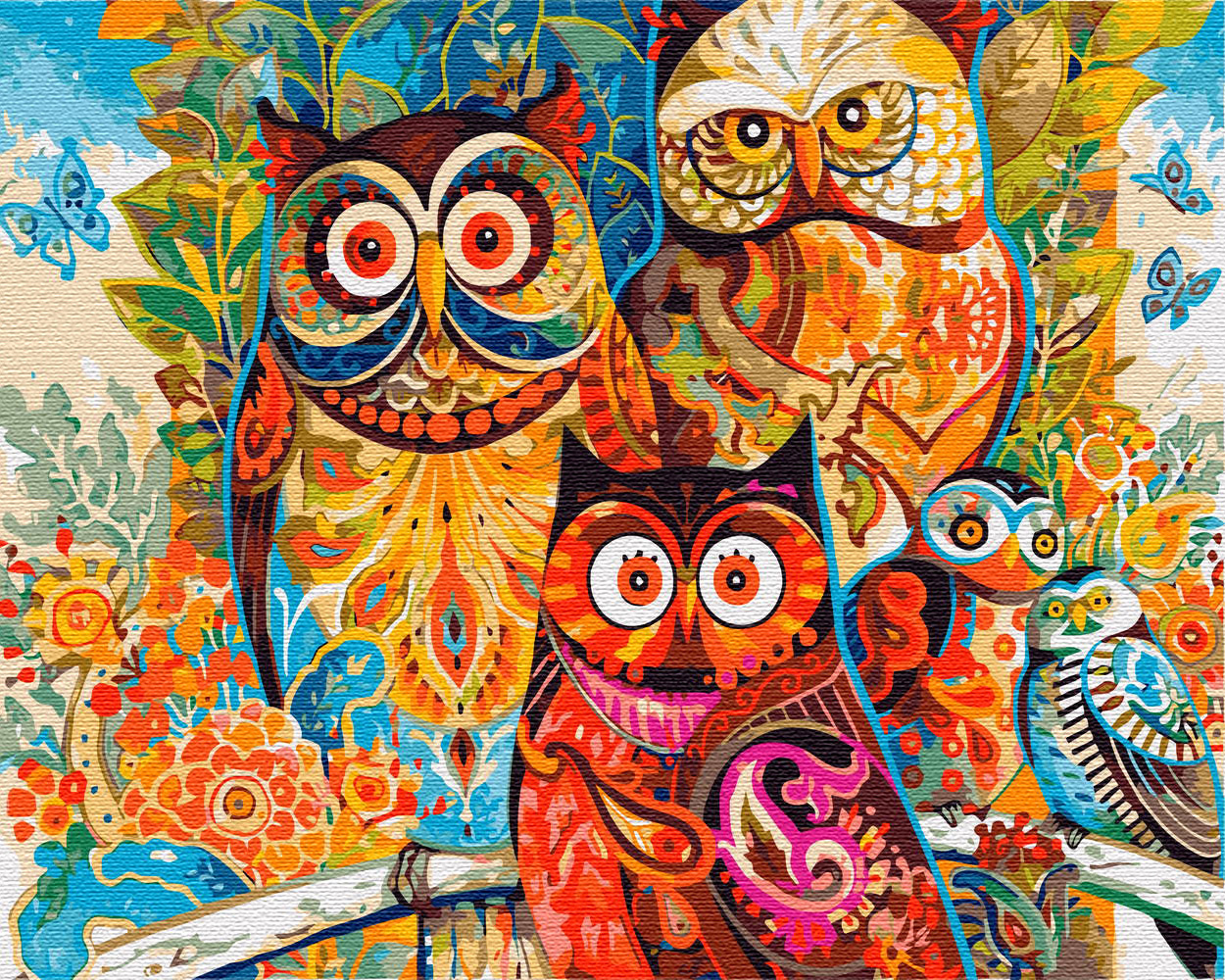 Malen-nach-Zahlen-Set Bunte Eulen 50x40 cm auf Holzkeilrahmen