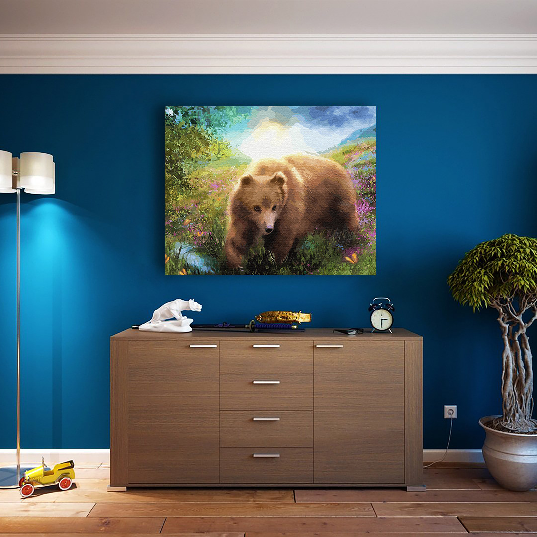 Malen nach Zahlen auf Keilrahmen – Bär im Garten der Morgenröte 50x40 cm Bild zum Ausmalen nach Zahlen