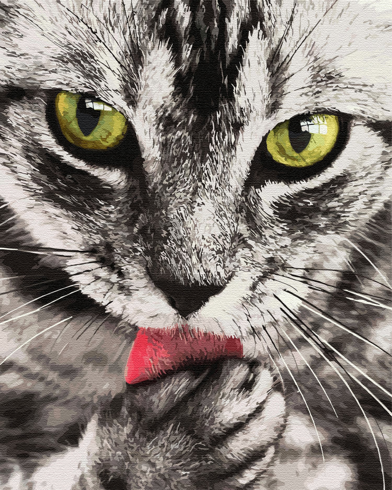 Malen-nach-Zahlen-Set Nachdenkliche Katze mit rosa Zunge 50x40 cm auf Holzkeilrahmen