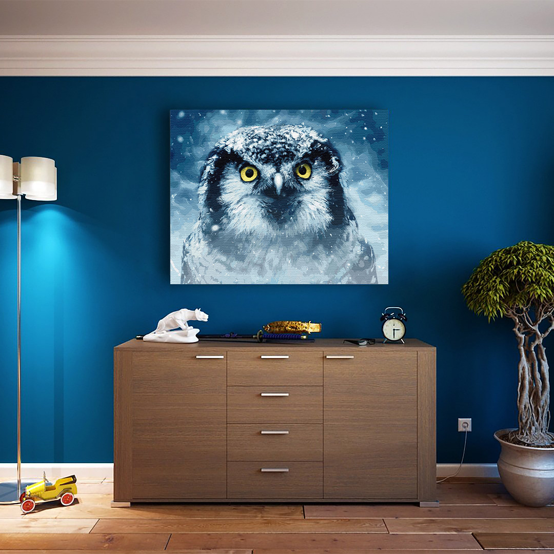 Malen nach Zahlen auf Keilrahmen – Eine Eule im Wintersturm 50x40 cm Bild zum Ausmalen nach Zahlen