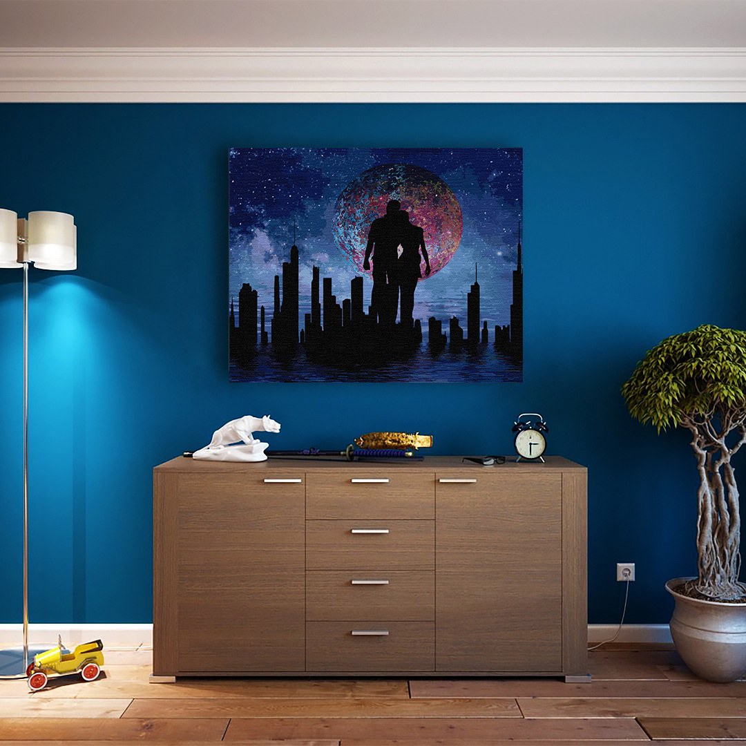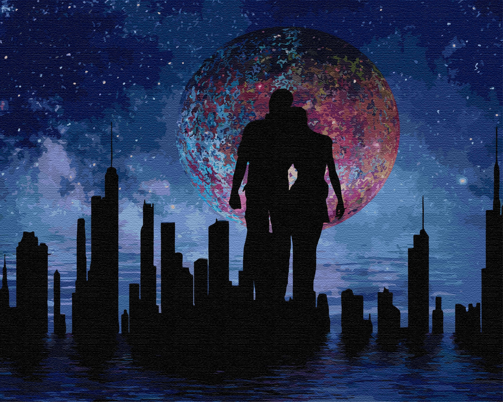 Malen nach Zahlen auf Keilrahmen – Silhouetten von Liebenden vor dem Hintergrund einer Weltraumstadt 50x40 cm Bild zum Ausmalen nach Zahlen