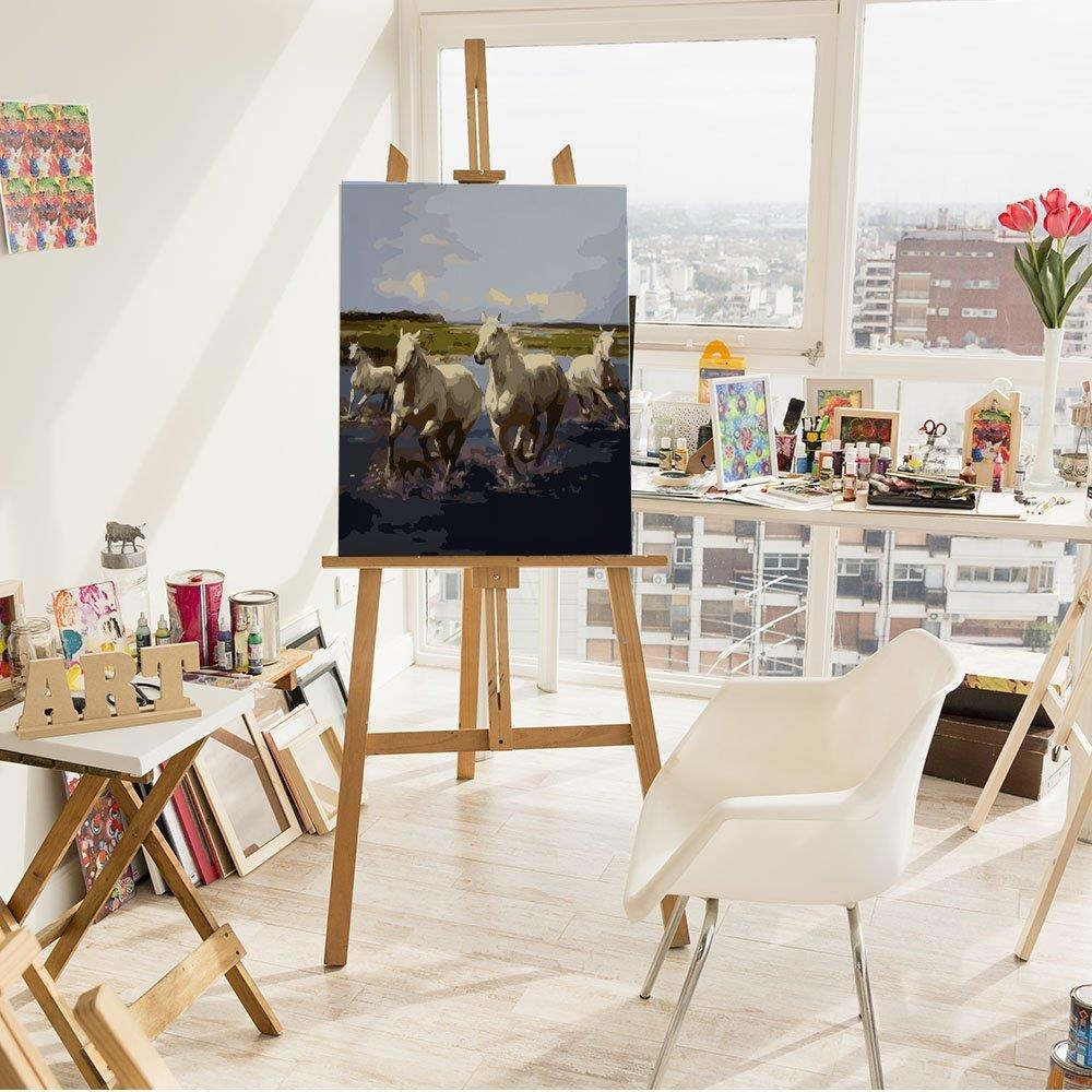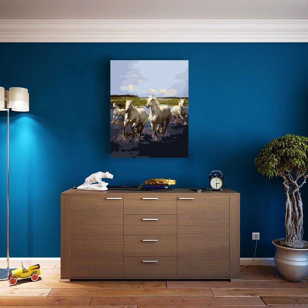 HINWEIS: Das Angebot gilt für ein Malset. Laufende weiße Pferde Gemälde nach Zahlen Größe 50x40 cm AUF EINEM HOLZRAHMEN